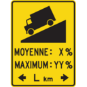 Le panneau D-230-13 doit être utilisé pour indiquer la moyenne des pentes pondérées par leur longueur ainsi que la pente maximale lorsqu’une route est ...